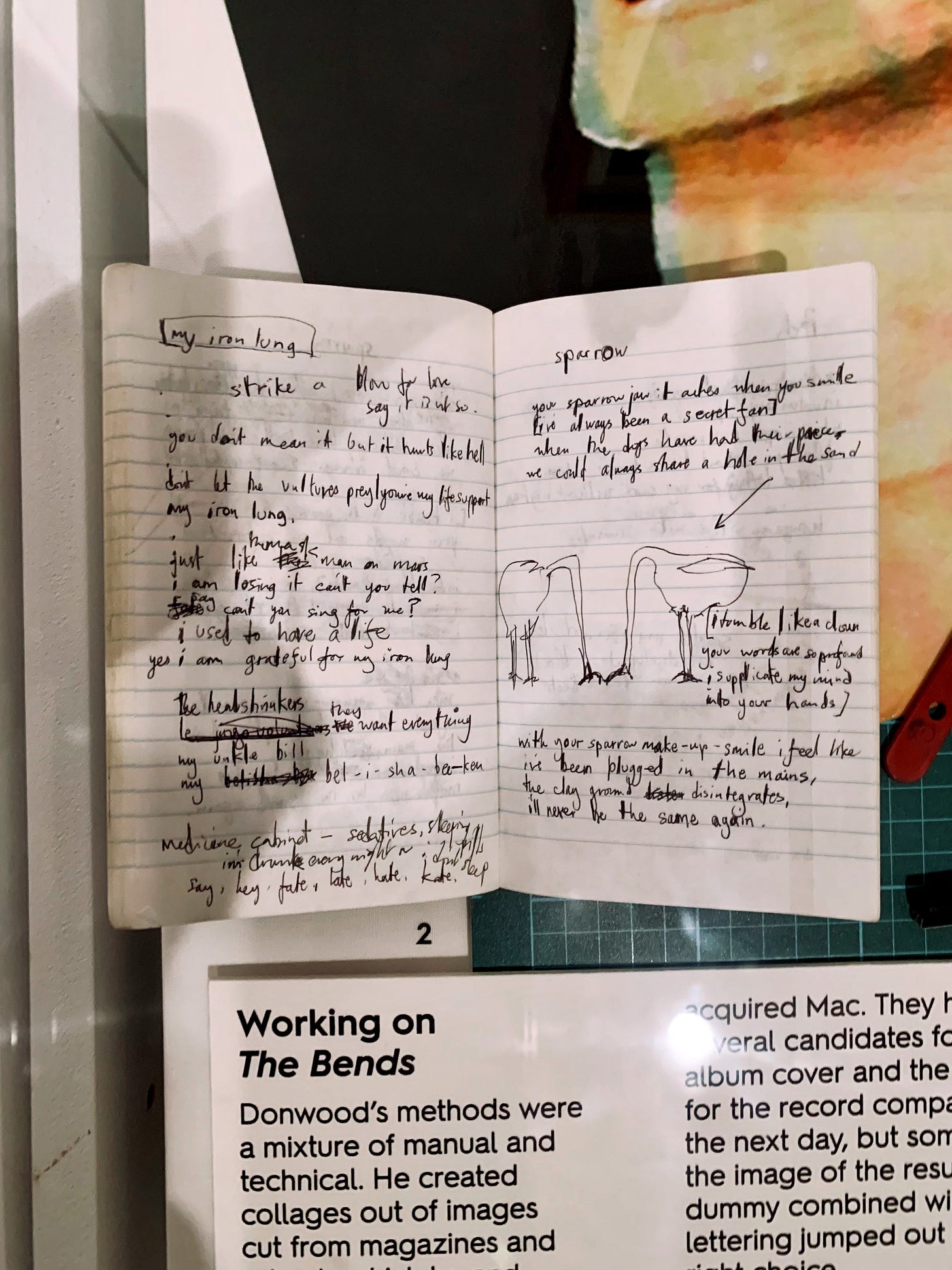 It was stunning. I couldn’t believe how extensive and open the show was. It revealed everything from Thom’s first scribbled lyrics and doodles for songs across every album to early artworks from all their releases, alongside the original final cover and insert designs, all there in plain sight. Visitors were allowed to take photographs of the exhibition, which added to the experience of feeling fully invited into this unseen world of their albums and artwork taking shape. I found myself laughing out loud a few times at the slightly bizarre and hilarious fax exchanges between Thom and Stanley, and moved by other notes and formative artworks for albums like Ok Computer, which I feel I’ve lived inside of for 28 years. After spending the luxury of a couple of hours alone, immersed in every single detail of the exhibition, it was time to leave Oxford and journey further afield to hear another long-time favourite band.